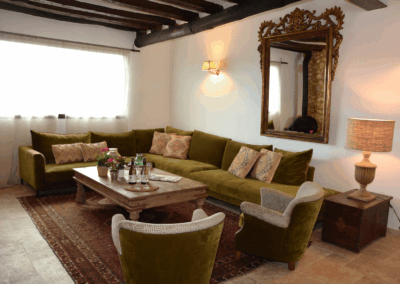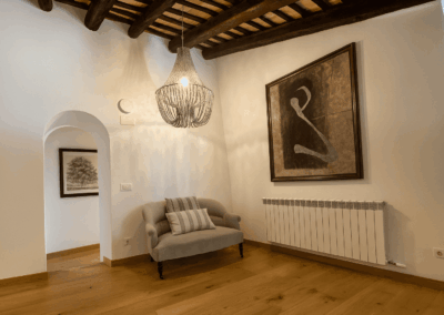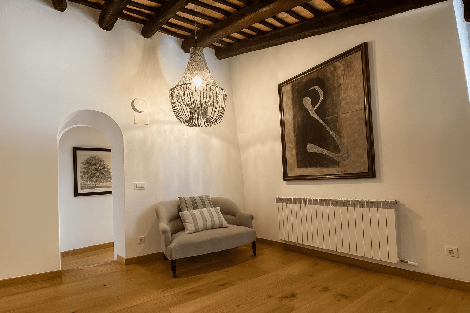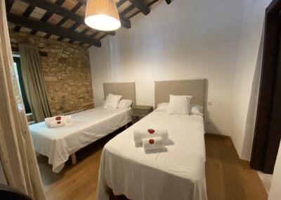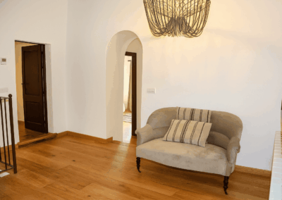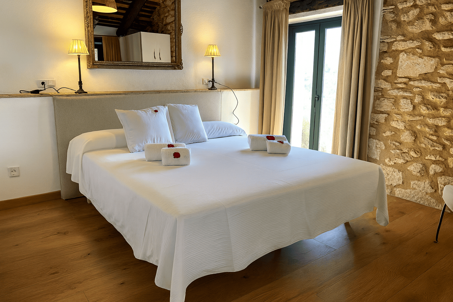 Al cruzar el umbral, el antiguo horno de pan, ahora convertido en un punto de luz cálido, da la bienvenida a los huéspedes y recuerda la vida rural de antaño. El nombre de la masía rinde homenaje a la plaza situada frente a la casa, donde las moreras centenarias brindan sombra junto al pozo de agua original, testigo silencioso de la historia del lugar.
